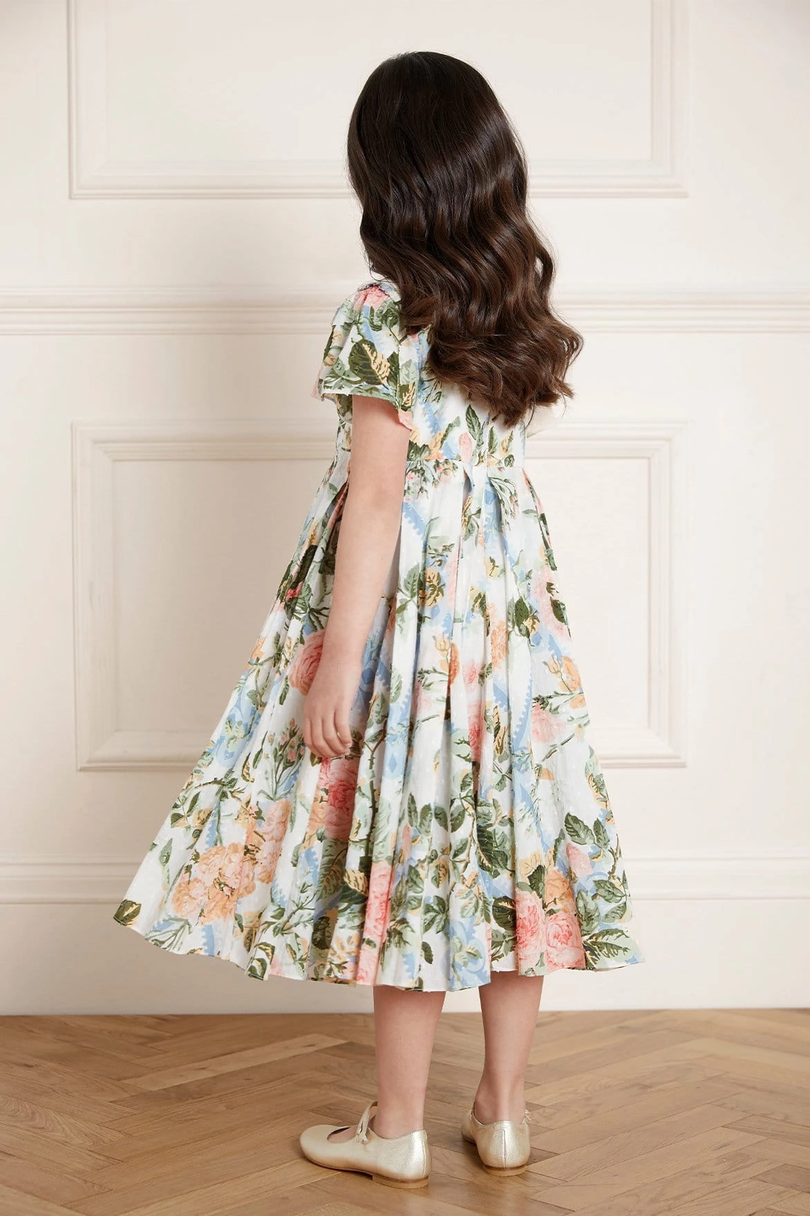 NEW SEASON | NEEDLE & THREAD EXCLUSIVE. The Rose Garden Cotton KIDS Prom Dress. This dress is elegantly crafted with soft cotton in a dotted, textured fabric. Printed with a beautiful rose and trellis design in soft, pastel tones. Boasting a box pleat skirt, creating a playful shape. Dress her up in the Rose Garden for any occasion.