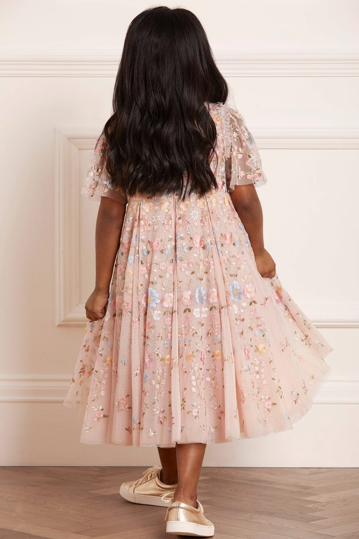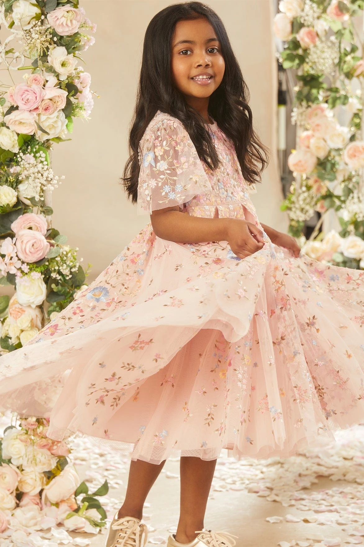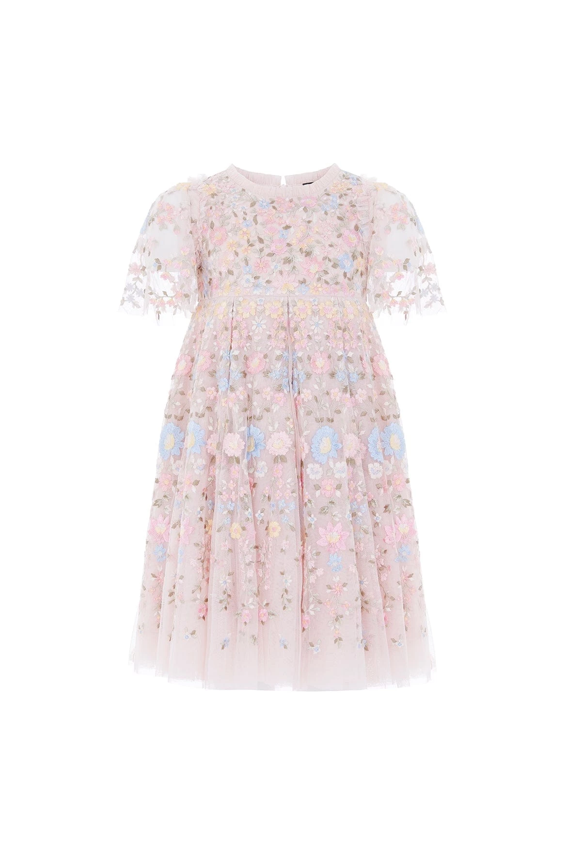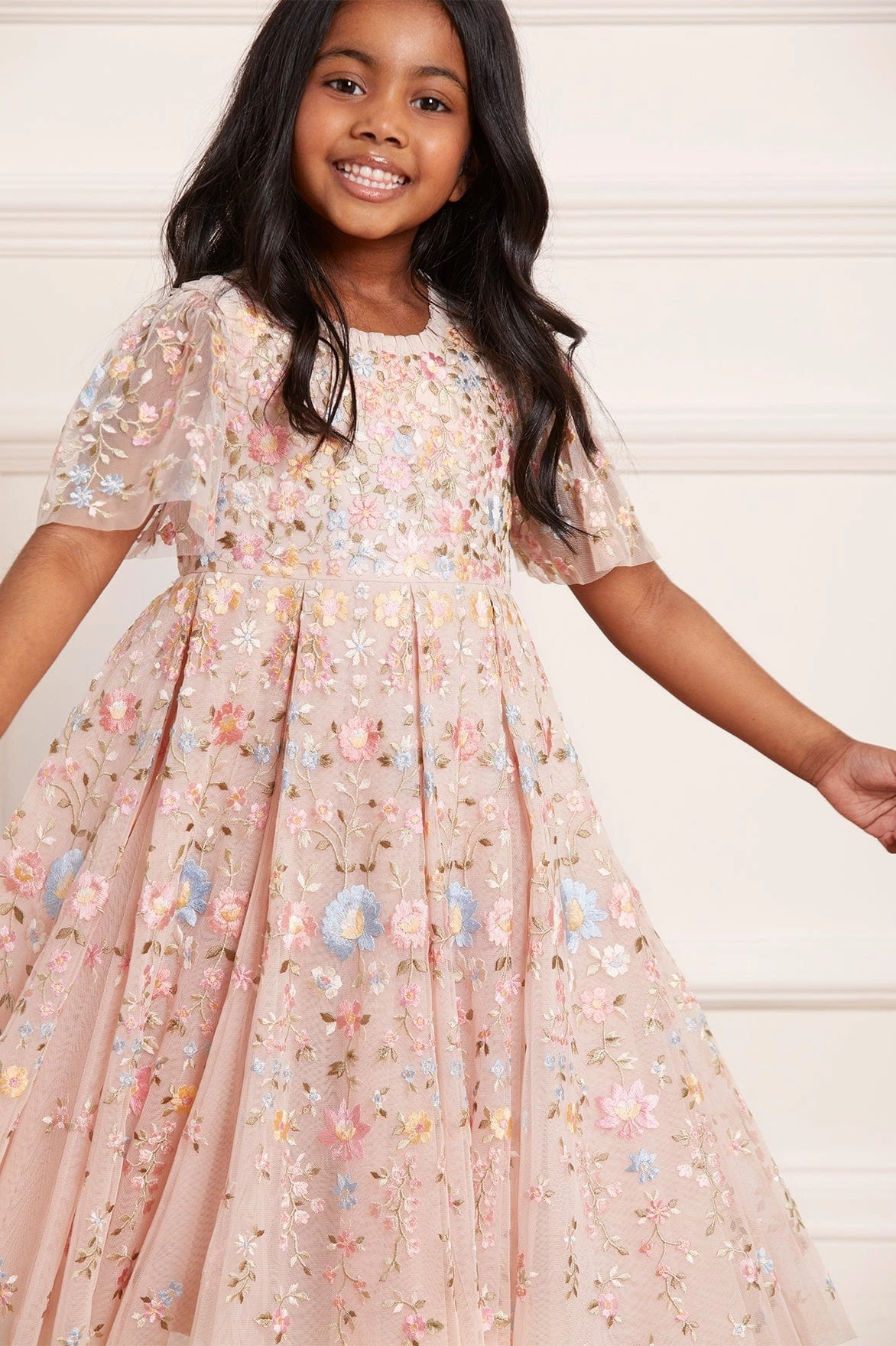 NEW SEASON | The Secret Garden KIDS Prom Dress in Petal Pink/Wildflower. This dress is decorated beautifully in statement embroidery artwork. Designed with floral motifs in pastel shades, a classic Needle & Thread loose shape and a pleated playful skirt. The perfect statement piece for her wardrobe.