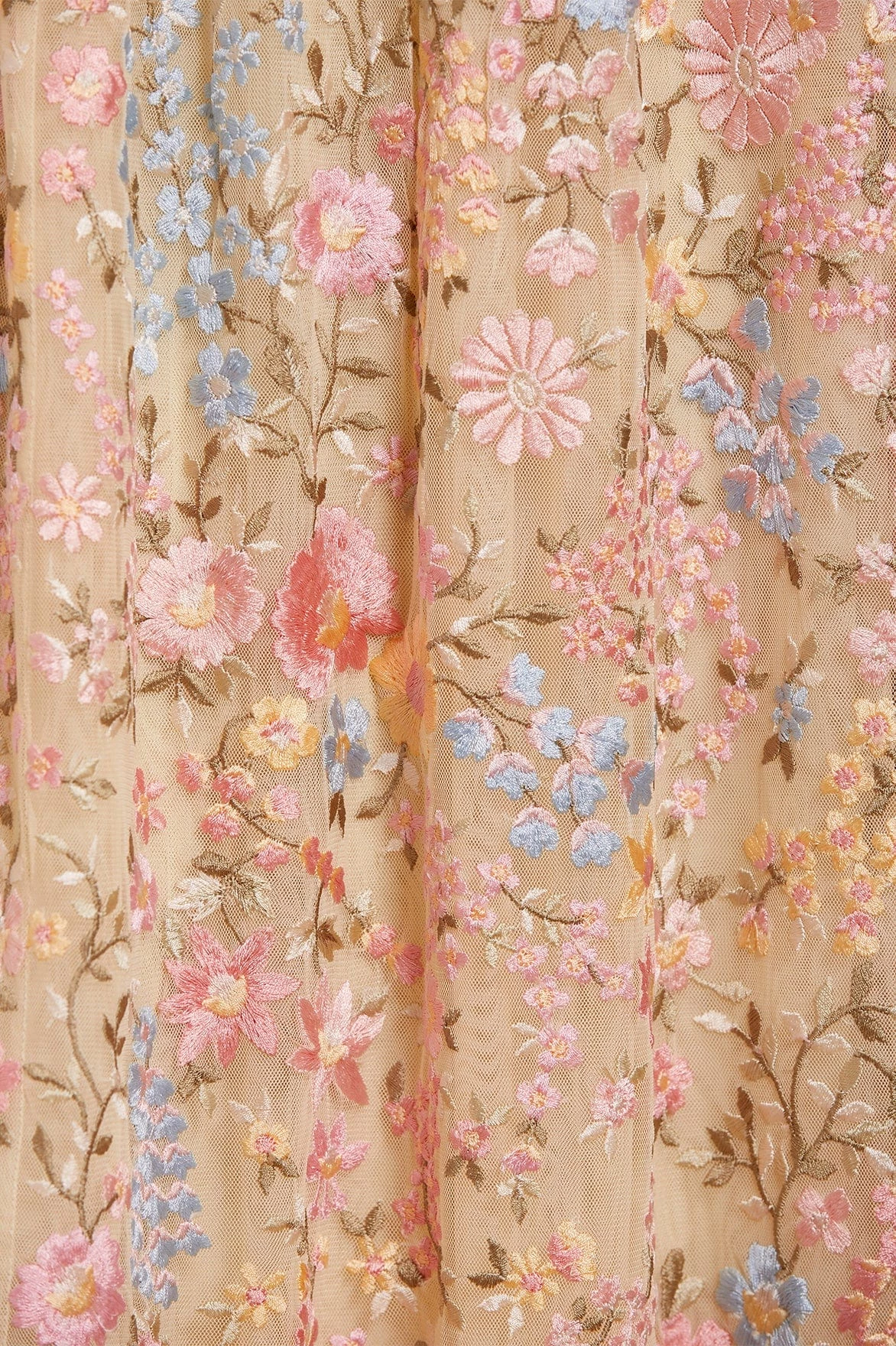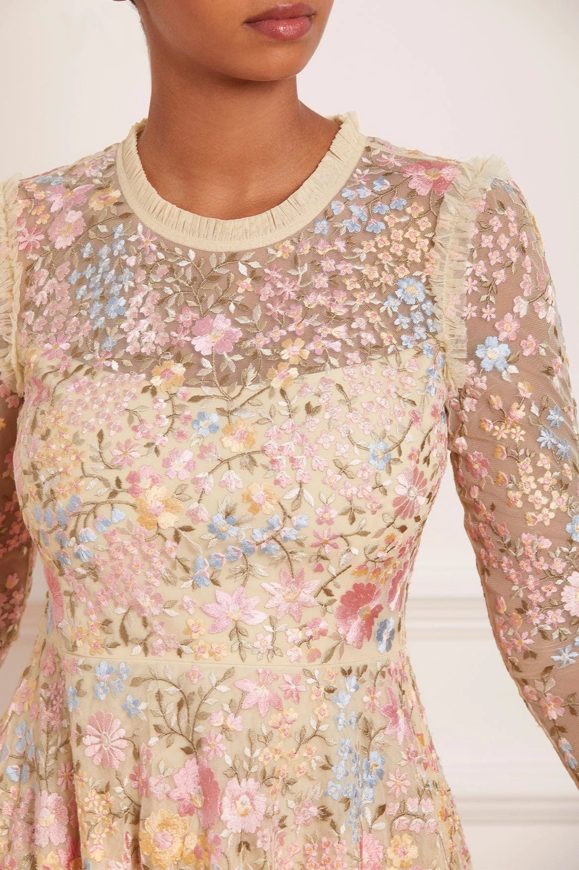 The Secret Garden Long Sleeve Ankle Gown in Buttercup / Wildflower. This statement gown features intricate scattered floral motifs in soft sunset colours. Beautifully designed with a couture-inspired skirt creating a flattering silhouette. A truly show-stopping piece.