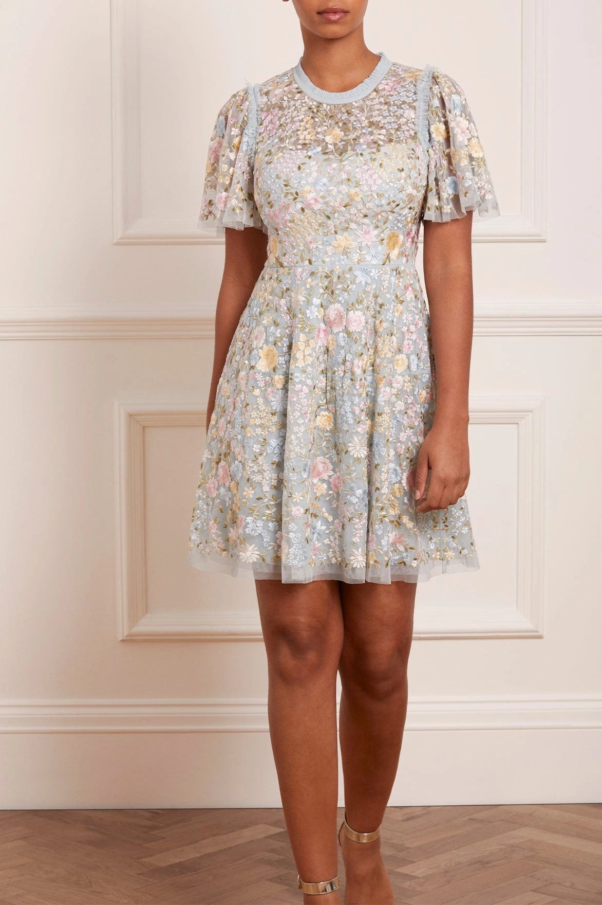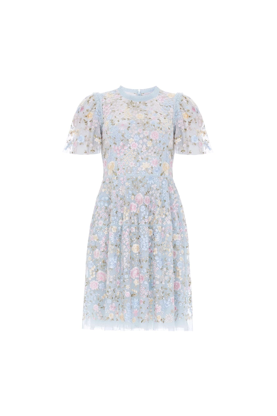 The Secret Garden Short Sleeve Micro Mini Dress in Spearmint / Summer Daze. This statement mini dress is embroidered intricately with floral motifs in soft pastel tones. Designed with a couture-inspired skirt with layered soft net to hold this beautifully cut shape creating an elegant silhouette. Developed with a round neckline, tulle frills and short sleeves. Make this dress your new wardrobe favourite.