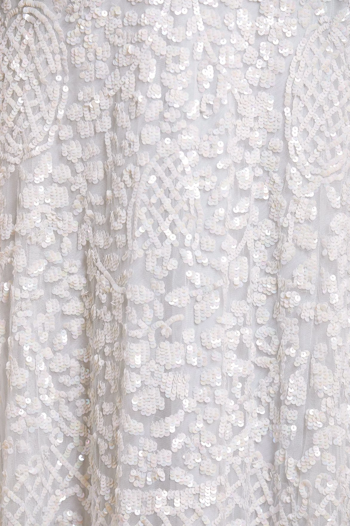 The Seren Long Sleeve V-Neck Gown in Ice Blue. This statement gown is adorned with a floral sequin artwork, creating an all-over shimmer effect. Beautifully designed with a v-neckline and sheer long sleeves. Crafted in our signature tulle, featuring an effortlessly flattering silhouette. Make a statement in this show-stopping gown.