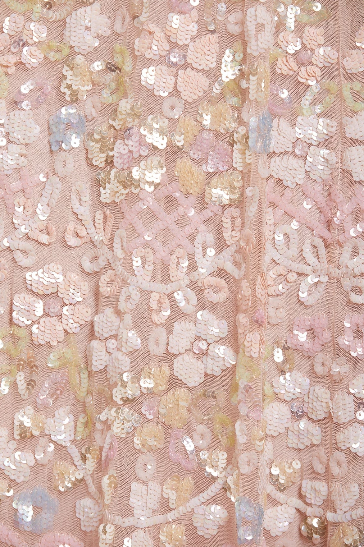 The Shimmer Fairytale V-Neck Gown in Petal Pink / Sundaze. Intricately adorned with a multi-coloured floral and bird artwork with shimmering sequins to create a romantic look. Beautifully designed with long sleeves, a V-neckline and Needle & Thread signature detailing. This gown is developed with a tulle net skirt to create a flattering silhouette. The ultimate fairytale piece.
