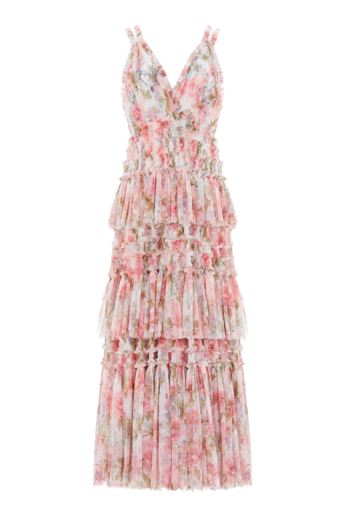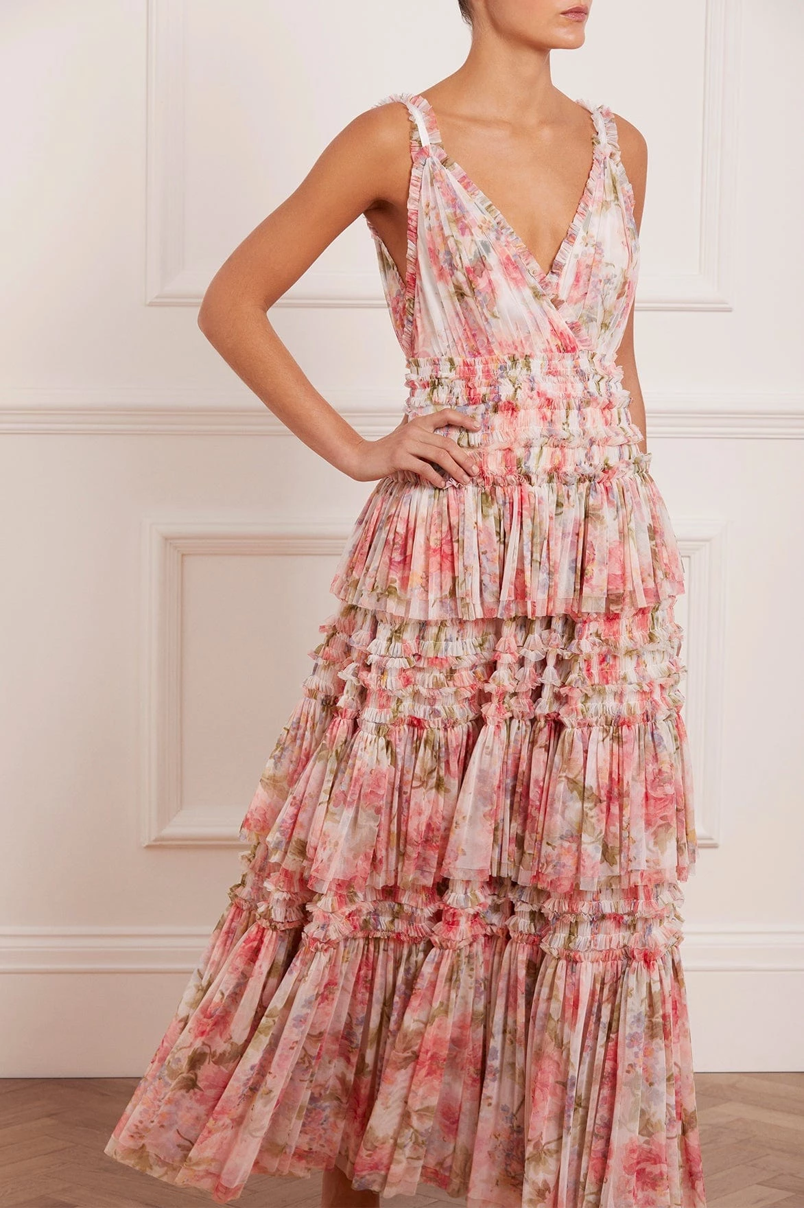 The Summer Song Candice Gown in Moonshine / Pink. This statement gown is beautifully printed with a romantic, floral artwork in sunset colours of dusk. This gown features whimsical ruffles and layered frills, creating a flattering look. Designed with a soft, layered tulle net for a romantic silhouette as you walk. Make the ultimate statement in this show-stopping gown.