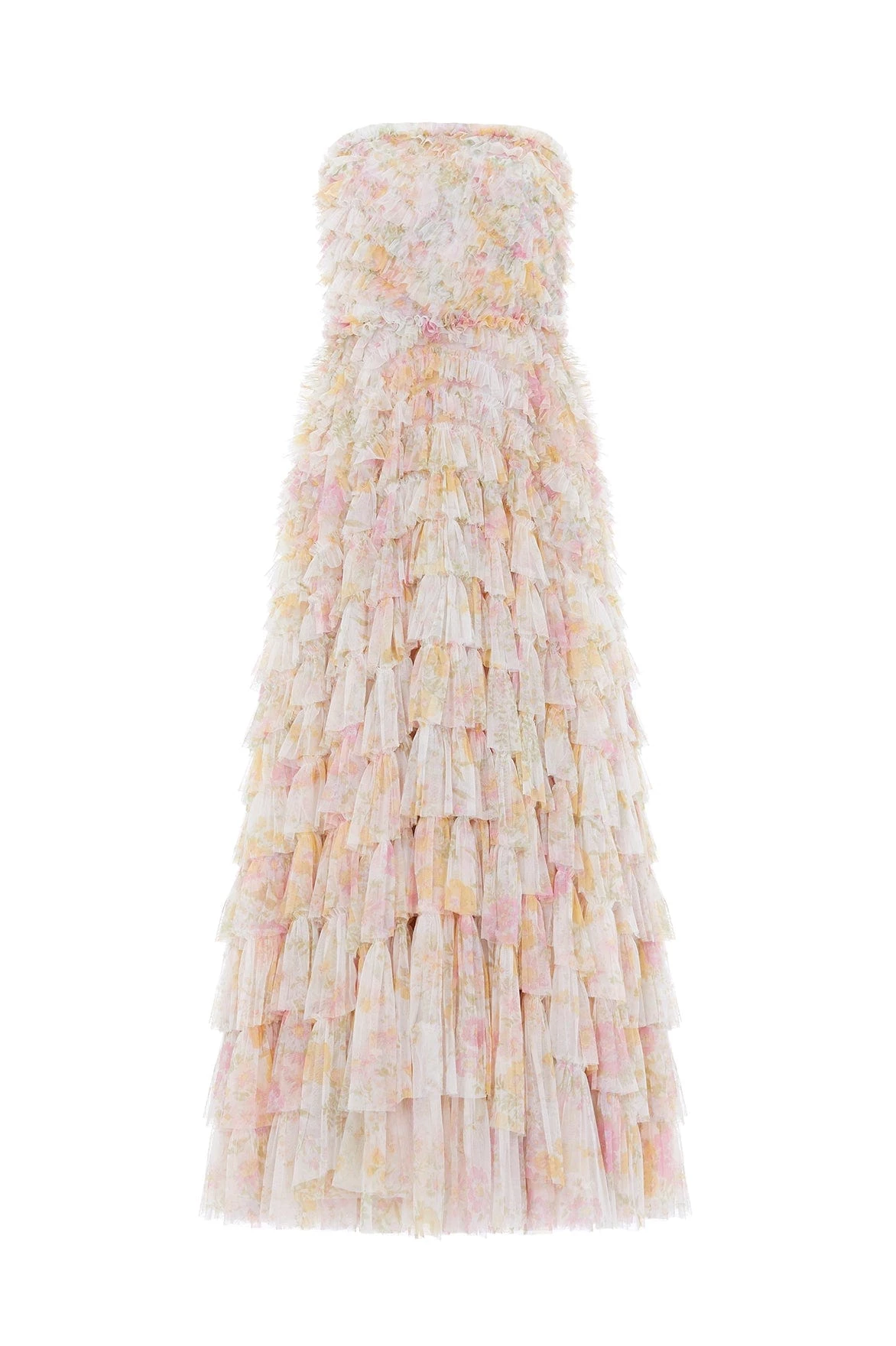 NEW SEASON |NEEDLE & THREAD EXCLUSIVE. The Sunrise Bloom Corset Ankle Gown in Moonshine. This corset gown is a classic, romantic style. Beautifully designed with large frills and layered tulle throughout the silhoutte, adding volume and creating whimsical movement. The print has been developed from an early 1900’s hand-painted artwork featuring soft, sunny pastel florals. The corset bodice features internal panels of power mesh fabric, adding structure to hold the silhouette in place whilst still allowing movement and comfort. Make a statement in the Sunrise Bloom.