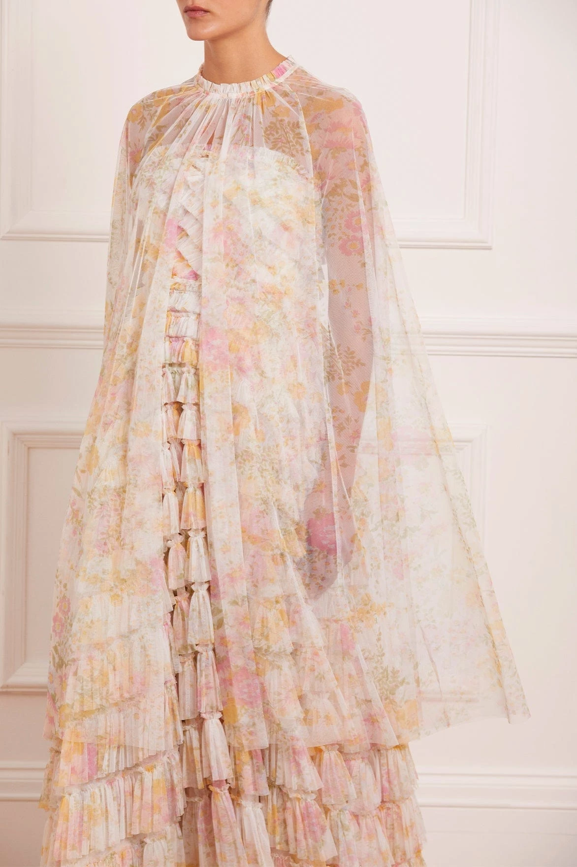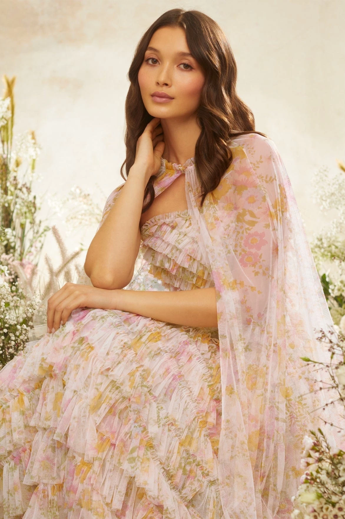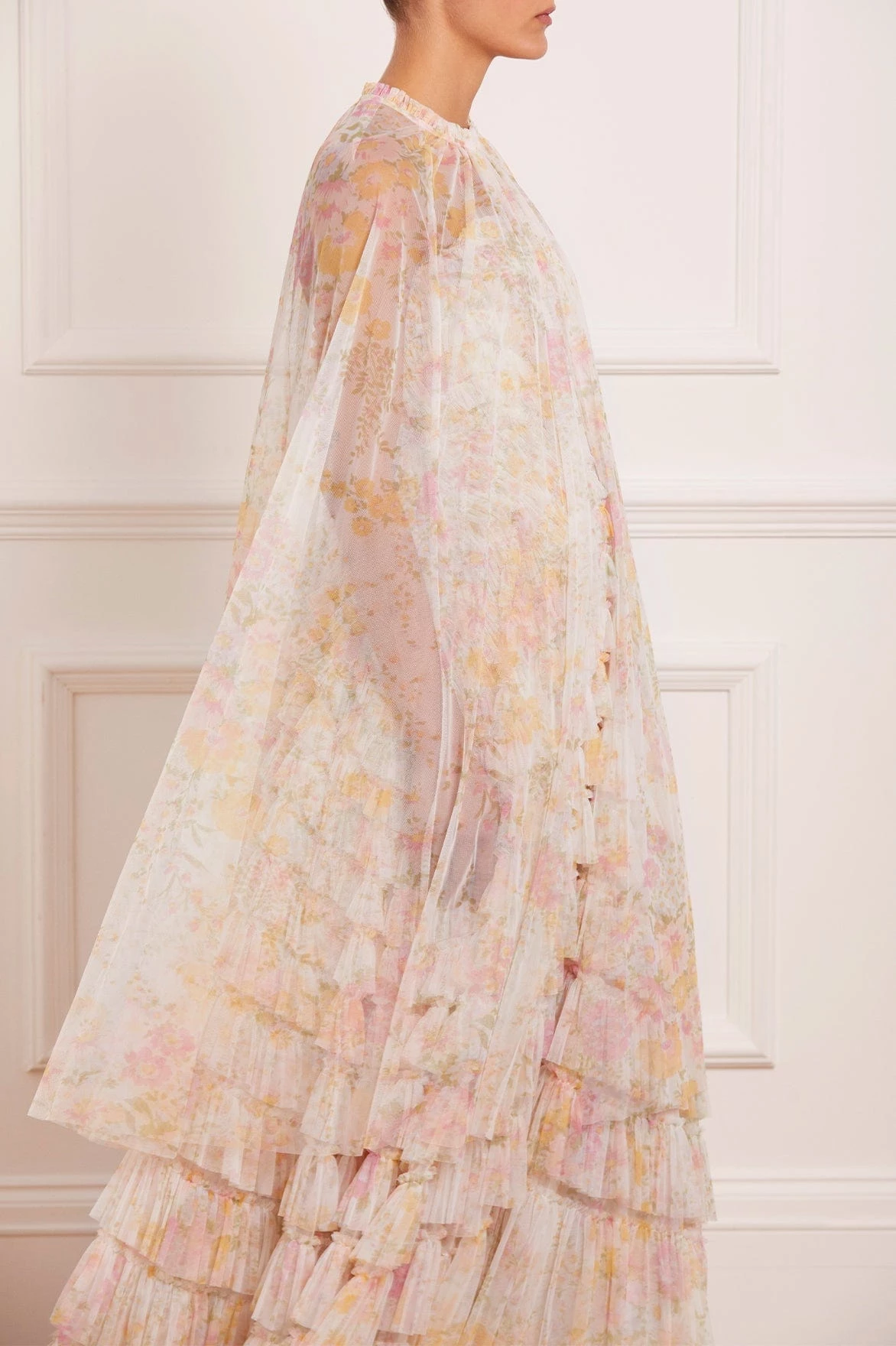 NEW SEASON | NEEDLE & THREAD EXCLUSIVE. The Sunrise Bloom Midaxi Cape in Moonshine. This cape is crafted from soft, delicate tulle and signature Needle & Thread detailing. The beautiful print has been developed from an early 1900’s hand-painted artwork featuring soft, sunny pastel florals. Designed with an easy hook and bar finish at the neckline. The perfect piece to layer over the Sunrise Bloom Corset Ankle Gown.