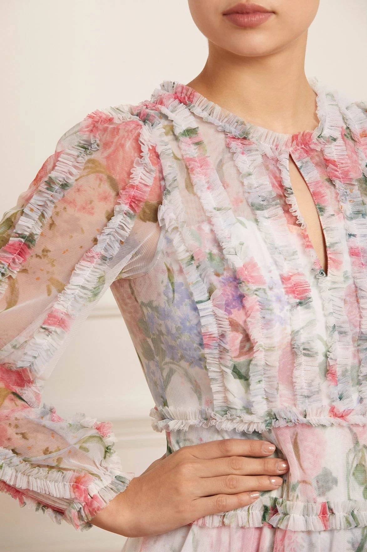 The Sweet Posy Ankle Gown in White / Multi. This beautiful piece is inspired by a print taken from a hand painted 1800s artwork. The gown features soft roses in layered colours, creating a romantic texture throughout. Crafted with perfectly proportioned tiers and a net layer to create a dramatic, statement silhouette. Sweep along to your next event in this truly romantic style.