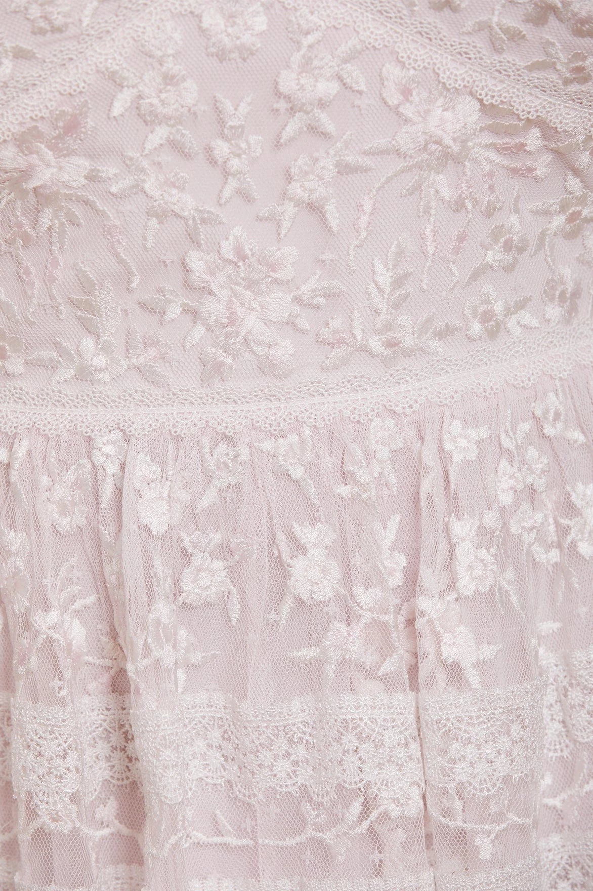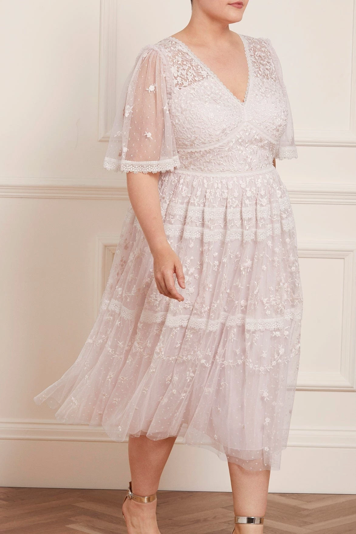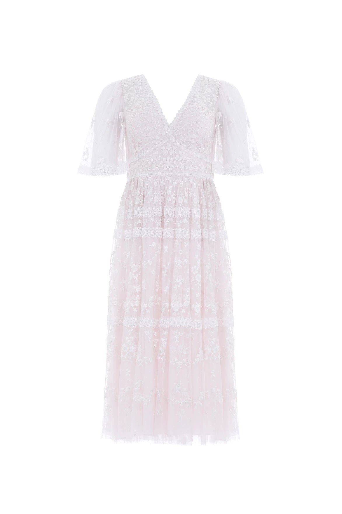 NEW SEASON. The Sweetheart Lace Midaxi Dress in Powder Pink/White. A signature Needle & Thread style. This midaxi dress is embroidered delicately with a floral lace artwork. Designed beautifully with intricate trimmed lace in pretty border motifs and perfectly positioned tiers through the skirt. Crafted from soft, kisses tulle creating a romantic texture throughout. The perfect dress to take you from day to night.