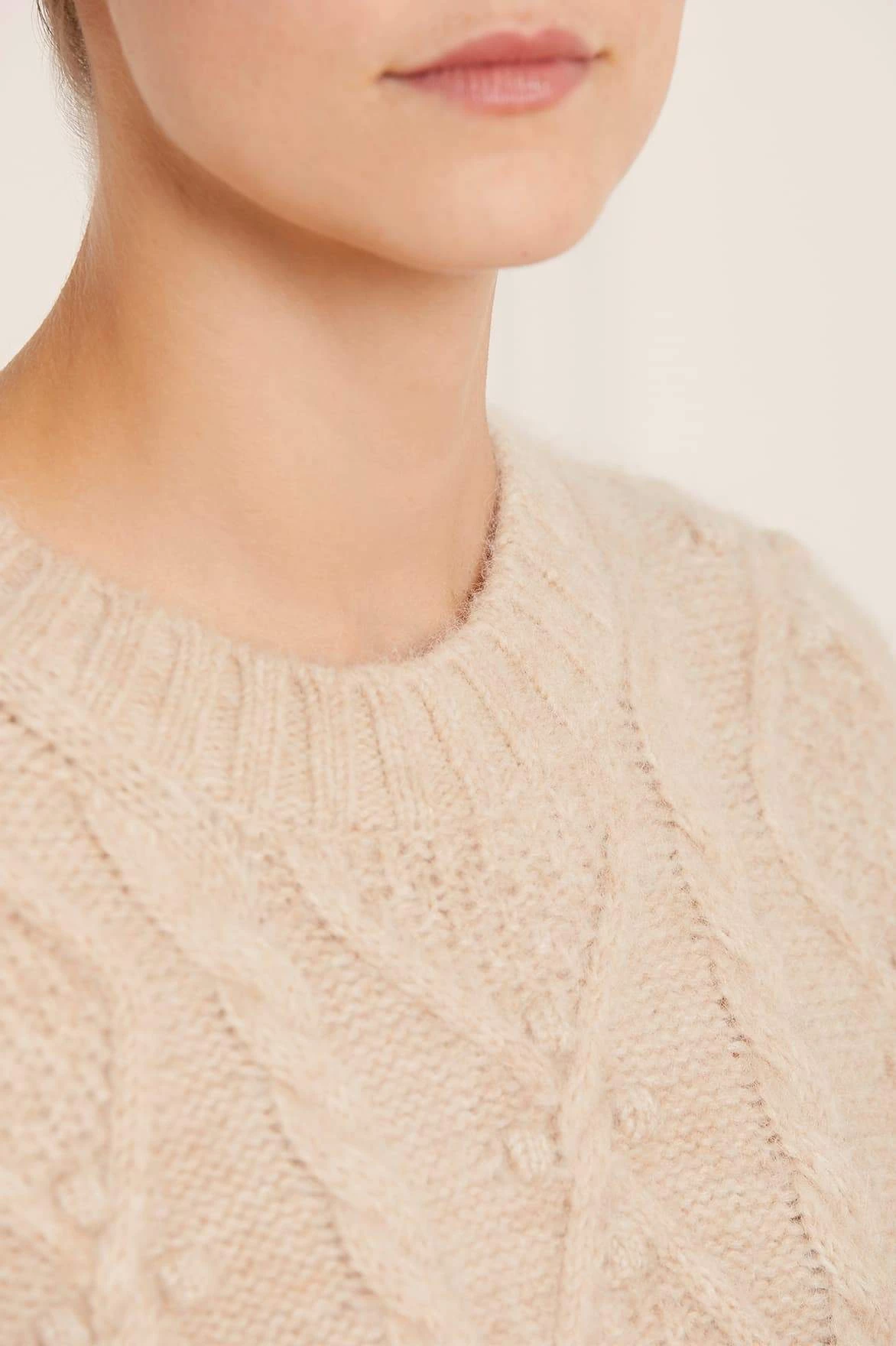 NEEDLE & THREAD EXCLUSIVE. The Sylvie Cable Longline Jumper in Birch. This premium knitwear piece is designed in a super-soft, fluffy alpaca-blend yarn. This cosy jumper is crafted with a mix of diamond-shaped cables and twists in an intricate textile. Adorned with playful flower bobbles adding a feminine texture. Designed with a relaxed fit, subtle split details and loose sleeves to create a cosy feel. The ultimate wardrobe staple this season.