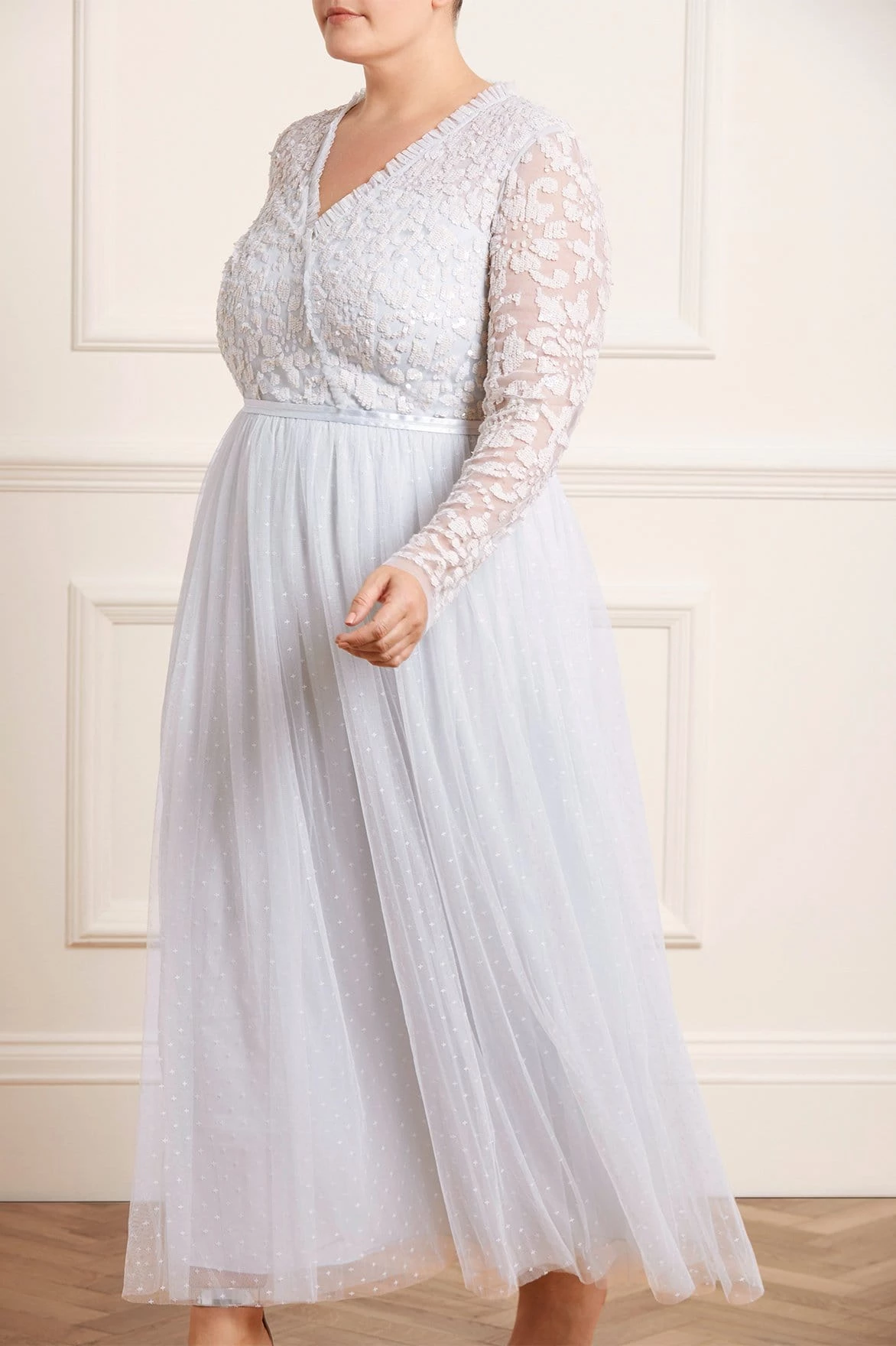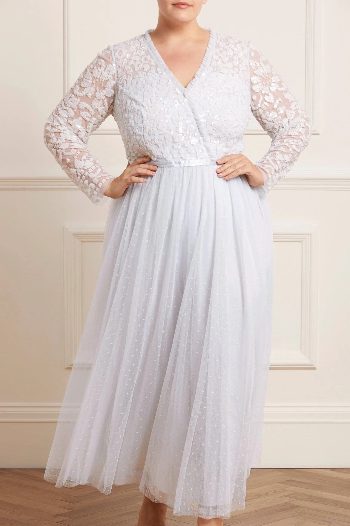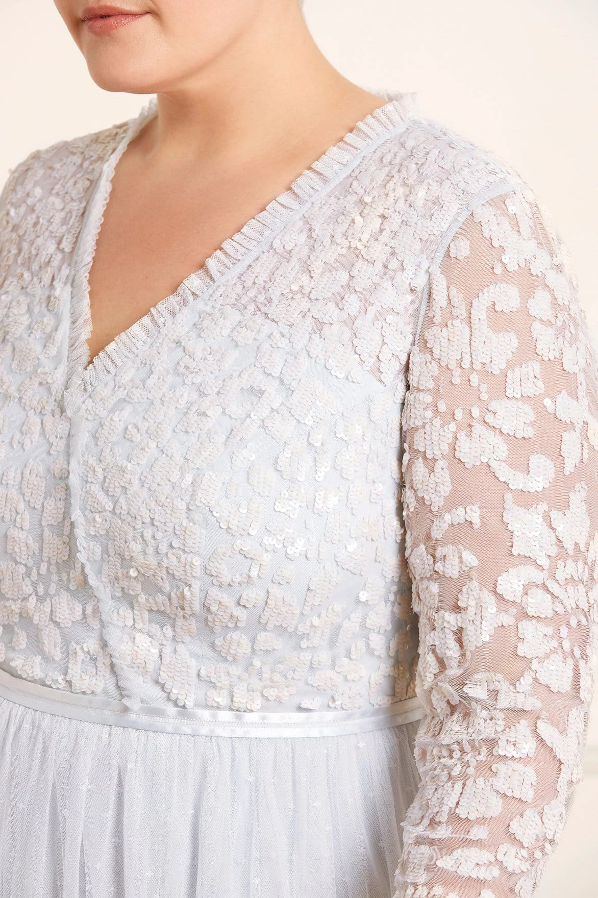 The Tempest V-Neck Bodice Ankle Gown in Ice Blue. This beautiful gown is inspired by a vintage lace tablecloth design. Its bodice is adorned with sequins, creating an all-over shimmer effect. Crafted with long sleeves, a v-neckline and a tulle multi-layered skirt. Make an entrance in the Tempest.