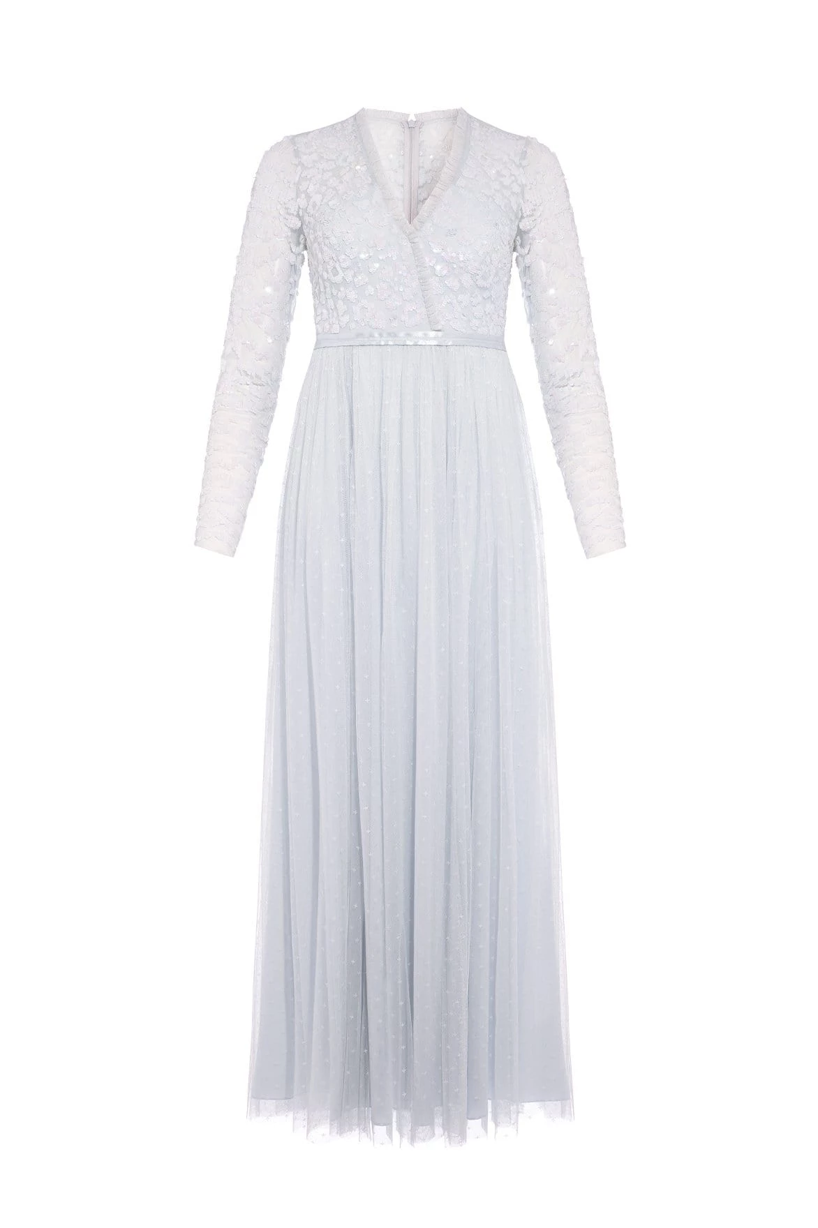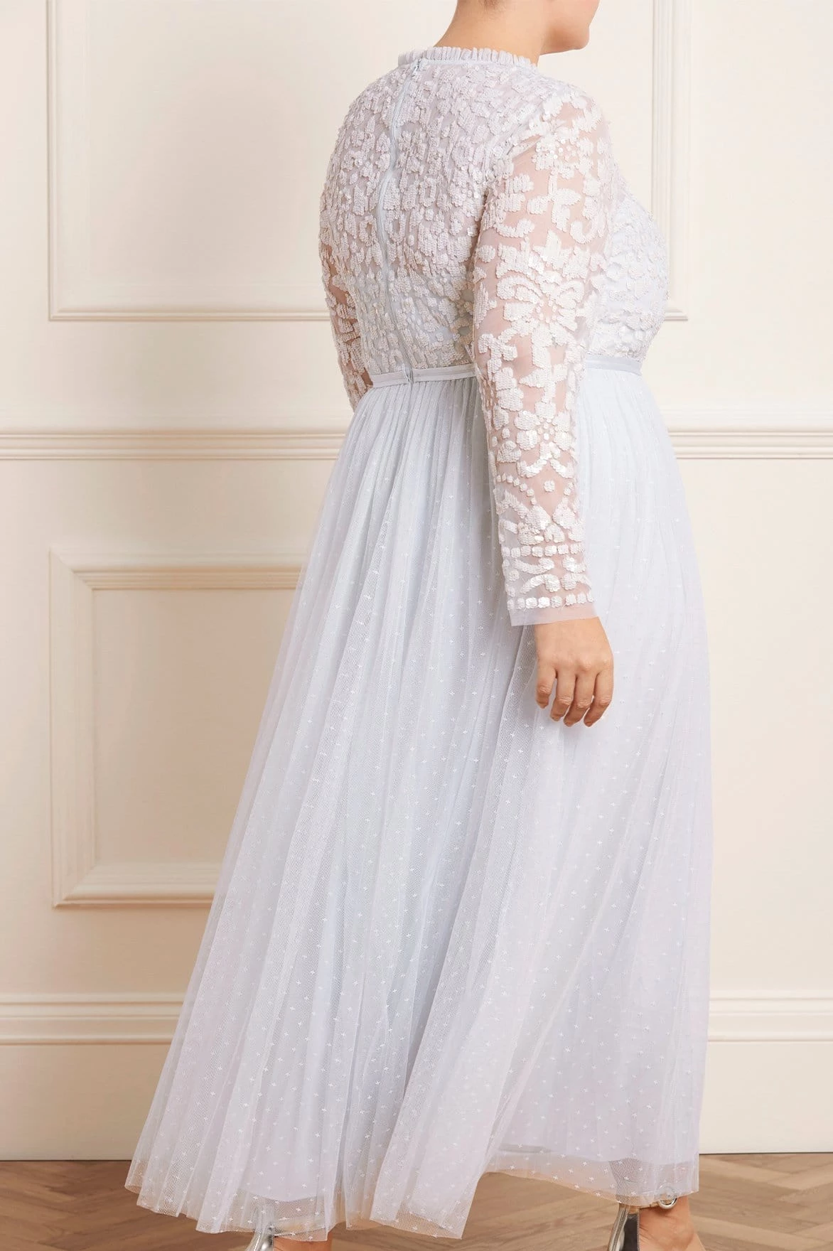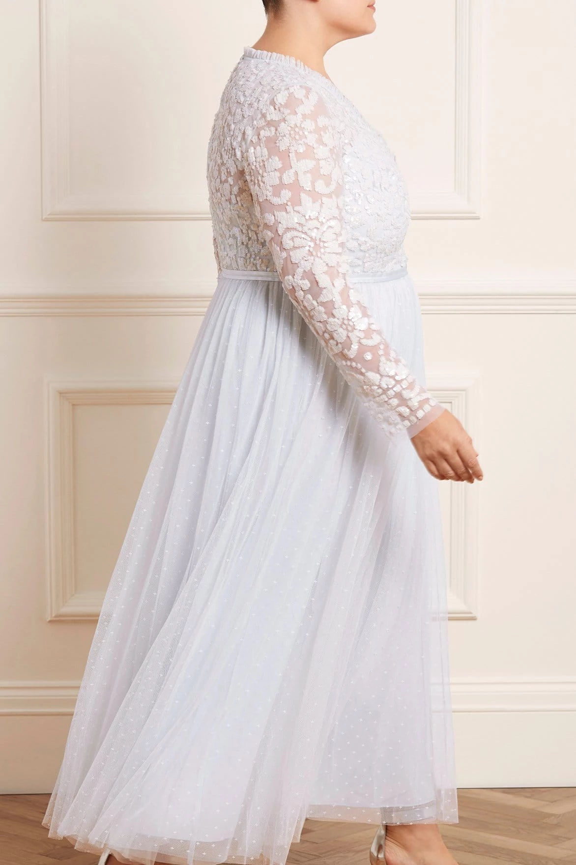 The Tempest V-Neck Bodice Ankle Gown in Ice Blue. This beautiful gown is inspired by a vintage lace tablecloth design. Its bodice is adorned with sequins, creating an all-over shimmer effect. Crafted with long sleeves, a v-neckline and a tulle multi-layered skirt. Make an entrance in the Tempest.