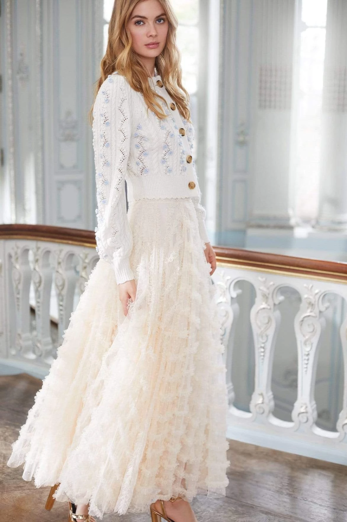 The Trailing Flowers Short Cardigan in Cream / Cornflower Blue. This soft-touch cardigan is developed from non-mulesed wool, creating a clean texture. Designed with intricate stitch details, formed lace pointelle and hand-crocheted flowers adorning the body and sleeves. This vintage-inspired cardigan is designed shorter in length with generous sleeves, making the perfect silhouette to style. An everyday piece and more.