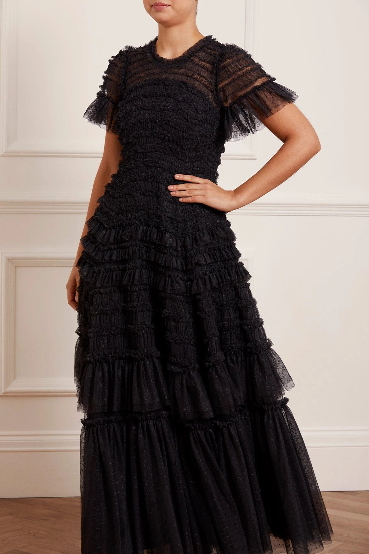 NEW SEASON. The Valentine Ruffle Gown in Graphite. A signature Needle & Thread style developed with textile ruffles and flattering tulle, creating a romantic look. The ruffles cascade down the dress, starting smaller and gradually getting bigger towards the hem to create soft, fluid movement. Crafted from our signature Needle & Thread kisses tulle. Make a statement in the Valentine.