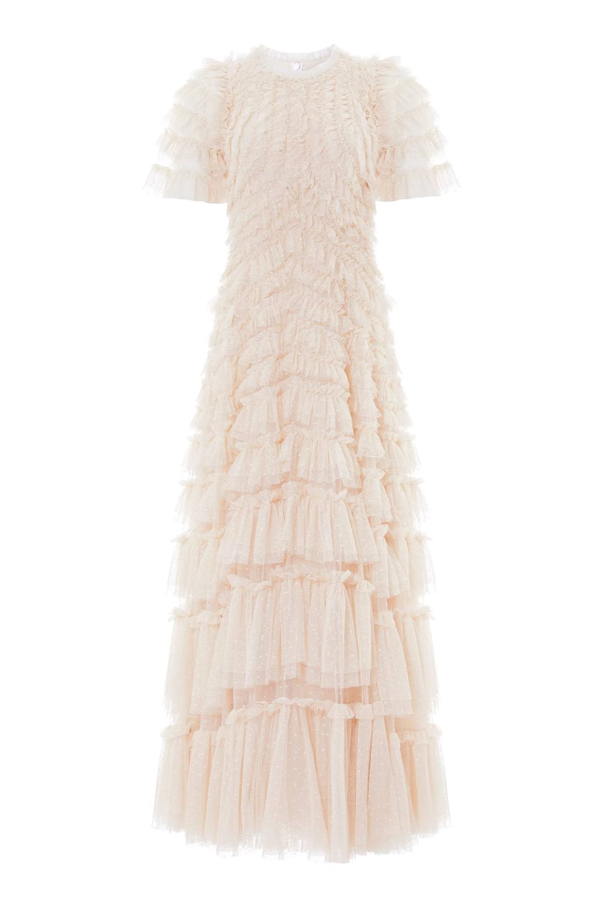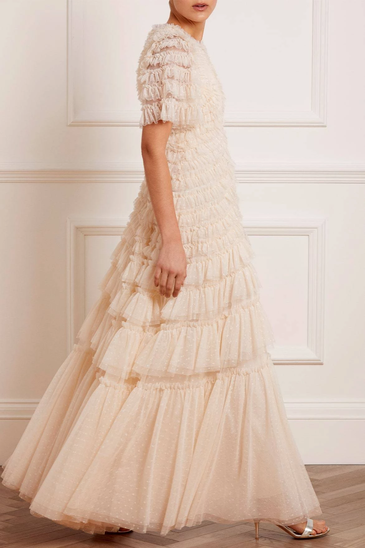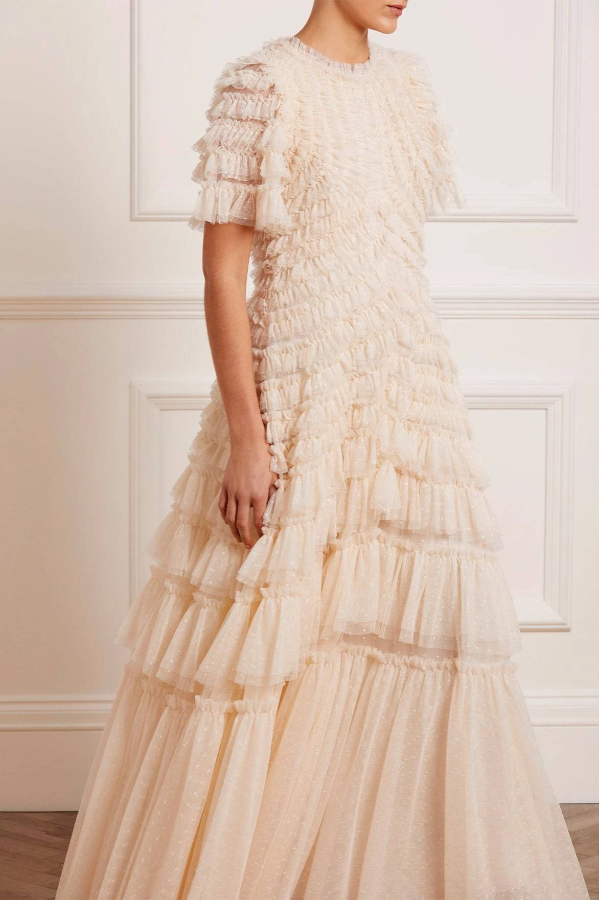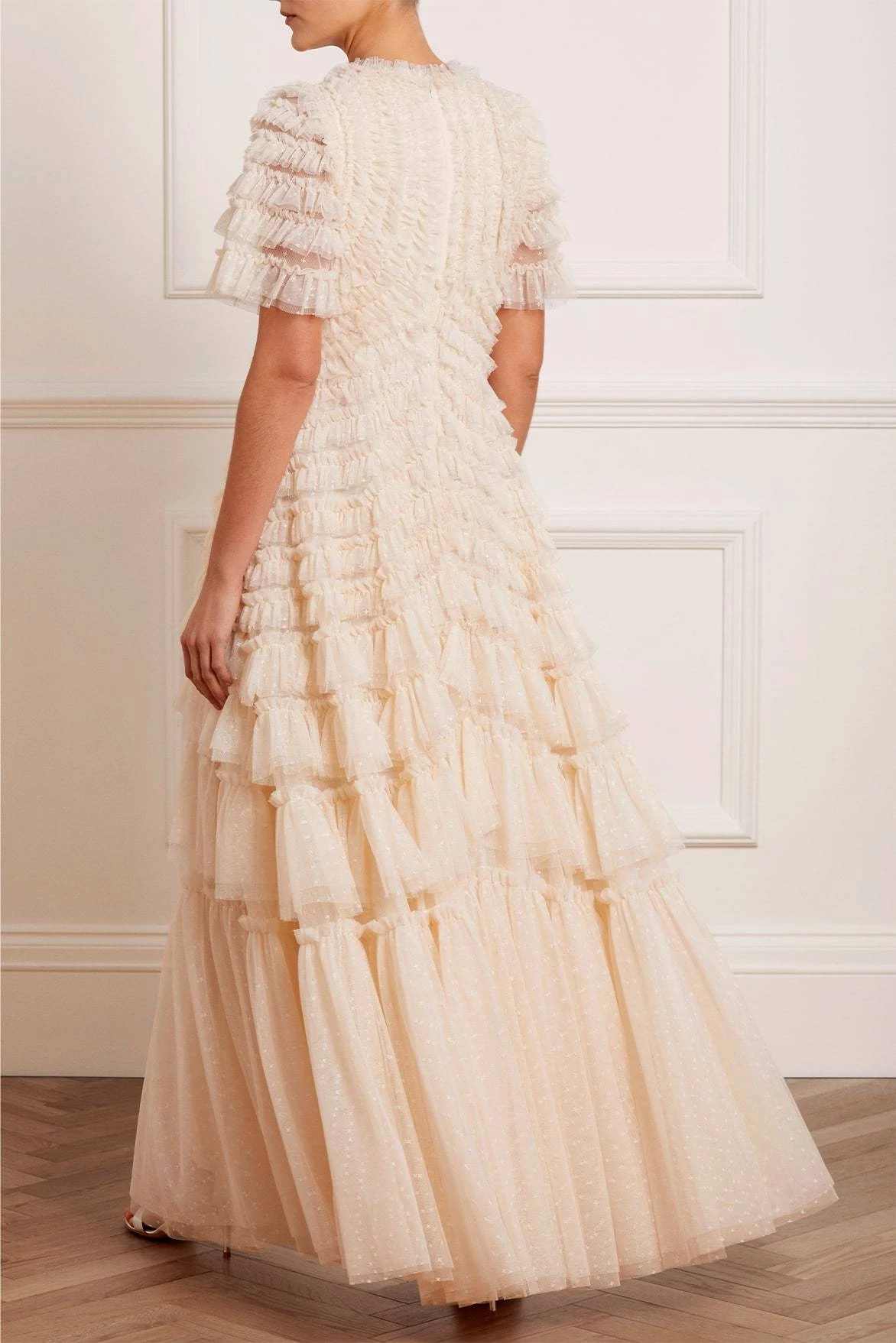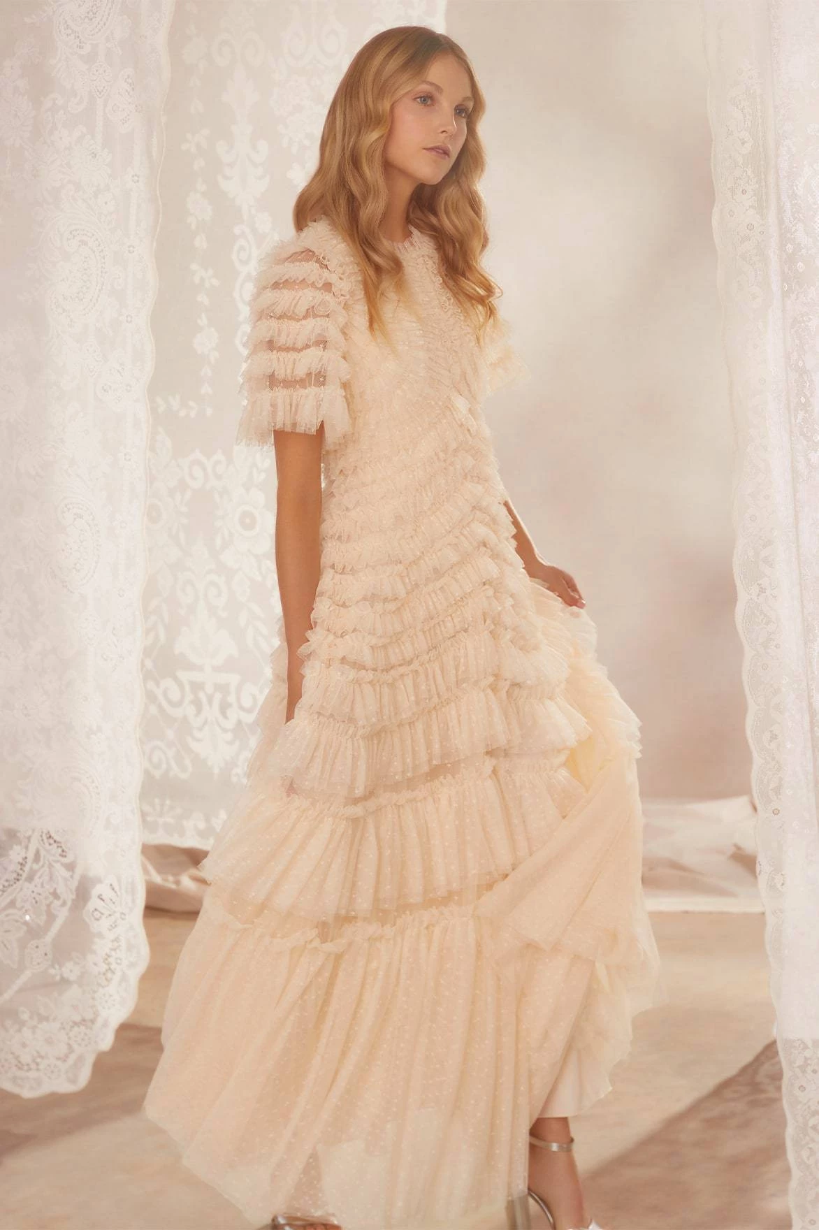 The Willow Ruffle Gown in Champagne. A Needle & Thread signature shape. This show-stopping gown is adorned with layers of tulle frills engineered to create a flattering texture. Developed from our kisses tulle, featuring an ‘x’ motif throughout. Make a statement in the Willow.