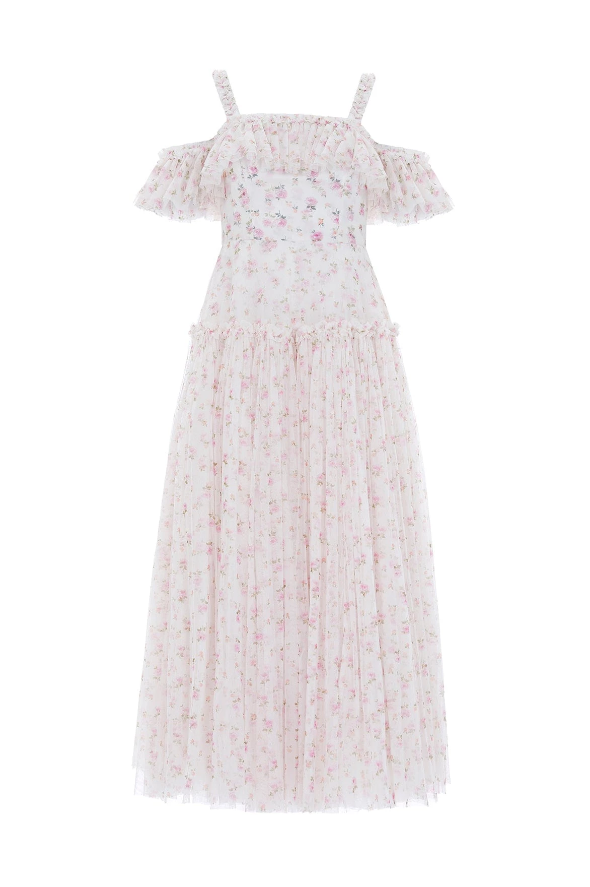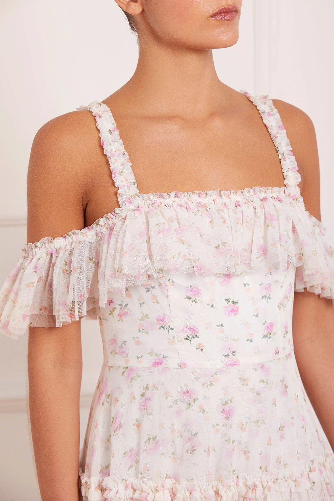 The Bijou Rose Off The Shoulder Ankle Gown in Moonshine / Wisteria. This cotton gown is decorated with a ditsy floral print scattered throughout. Designed beautifully with a tiered off the shoulder frill for flattering coverage, elasticated straps and a dramatic statement skirt. This gown is crafted with layers of soft tulle and a rigid net to create a pretty fairytale silhouette. Make a statement in this whimsical piece.
