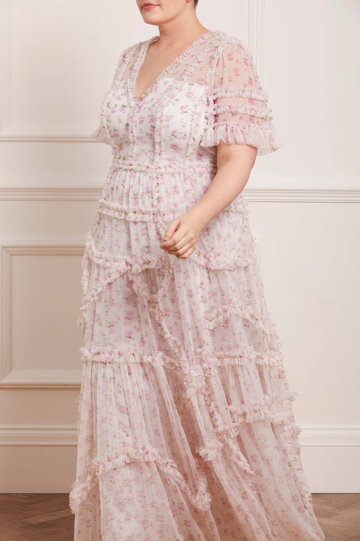 The Bijou Rose Ruffle Gown in Moonshine. This gown is decorated with a ditsy floral print scattered throughout. Designed beautifully with a V-neckline, ruffle trims and signature Needle & Thread detailing. The perfect gown to take you from day to night.